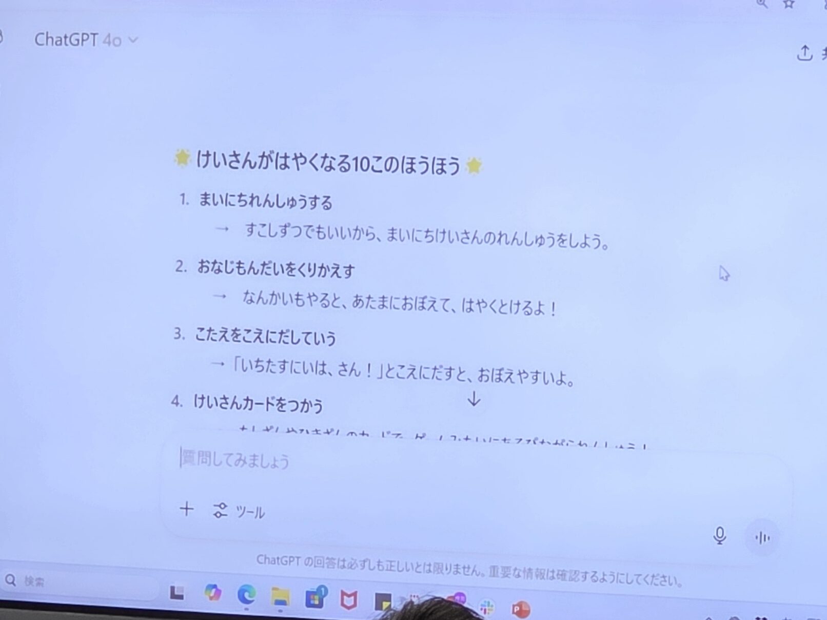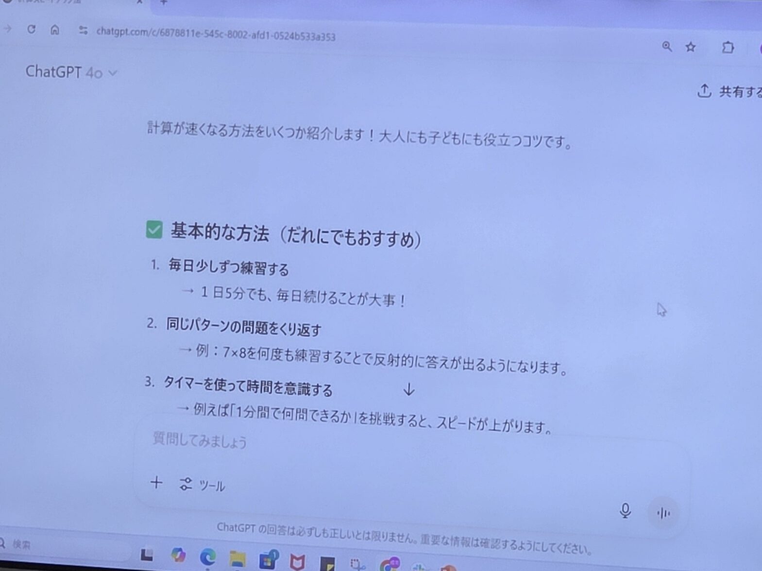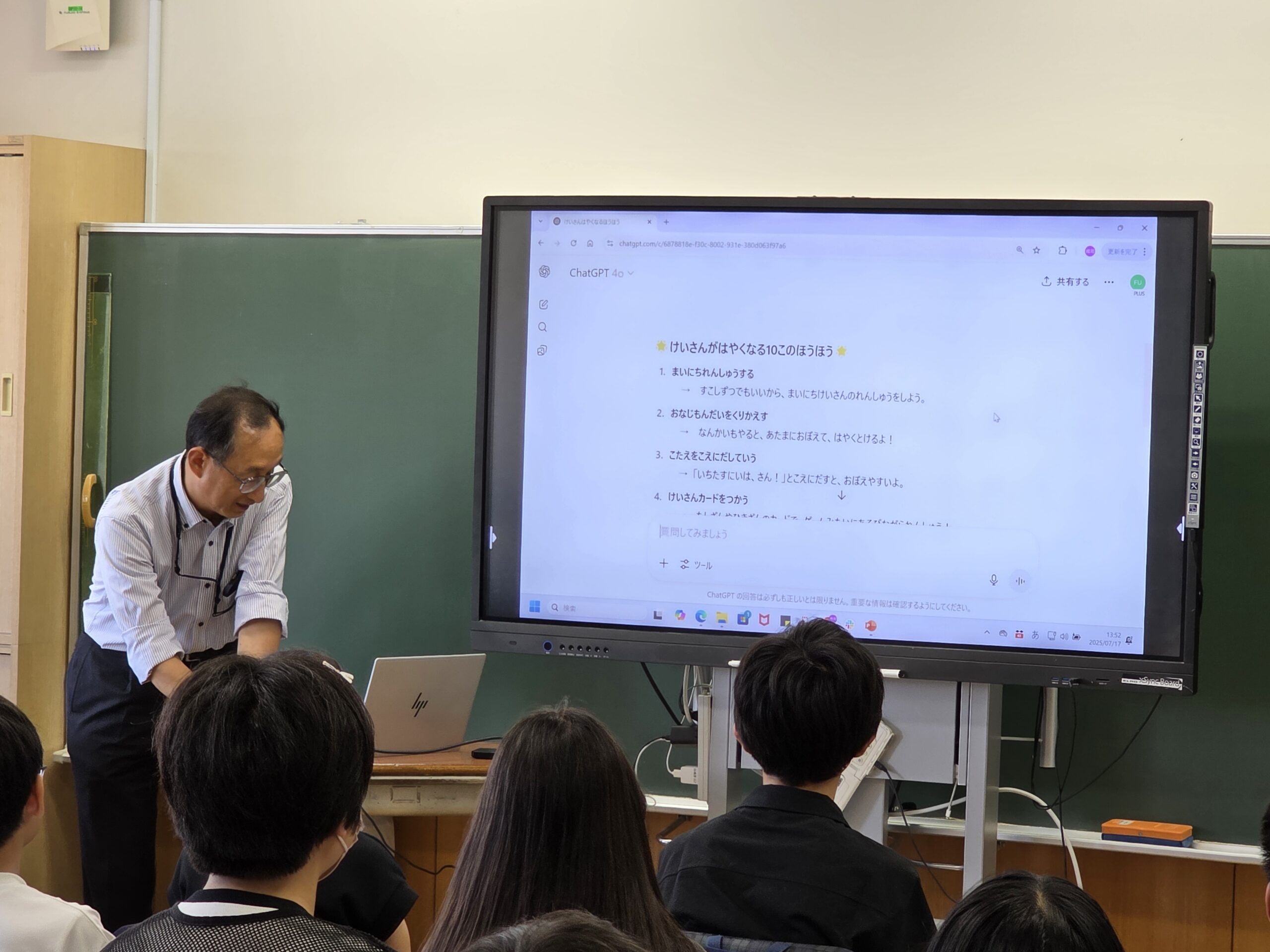 | 1.『どんな人に向けた回答かを示す』 こと。 ChatGPTに「計算が速くなる方法を教えて」と入力し、子どもたちとChatGPTの回答を確認しました。すると、九九を覚えましょう、見直しをしましょう、などのアドバイスが出ました。そこで、「これが小学1年生ならどうかな?」と古谷は子どもたちに考えさせます。そして、1年生は漢字が読めないという子どもたちの意見も取り入れ、「小学1年生です。計算を早くする方法をひらがなで教えてください」とプロンプトを修正し、対象を明確にした場合の回答の変化を確認しました。 2.『具体的に書く』 こと。 次に、教室で今後予定しているテストについて聞きながら、「小学6年生です。2か月後の漢字50問テストで100点を取れる方法を教えて」と入力してみました。すると、ChatGPTはテスト本番へ向け8週間前からテスト当日までの具体的な克服ポイントや勉強スケジュールまで提案してくれました。さらに生成AIからの提案に乗って、問題も作成してみました。ただ、作ってくれた問題に子どもたちの反応はひまひとつ。小学6年生用というよりは、小学1年生から6年生までの漢字が問題になっているようでした。すかさず古谷は、小学6年生で習う漢字で問題を作ってと付け加えるといいかもしれないねと、具体的に書く大切さについて伝えました。 3. 『回答の形式を指定する』こと。 次に、社会科のテスト勉強を例に、「勉強の方法を10個教えてください」と、例えば個数を指定すると、指定通りに回答することを確認しました。 |