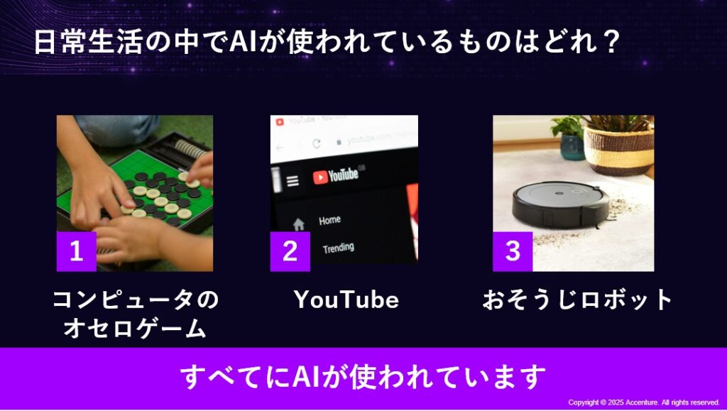 その後、クイズを交えながら、コンピューターのオセロゲームやYouTube、お掃除ロボットなどを例に、それぞれどのような設定でAIが使われているのか説明しました。例えばオセロでは「挟むと色が変わる」「石を反転できる場所に置く」「角を取ると勝率が上がる」などのルールや戦略がコンピュータに設定されており、AIはそれを理解してゲームを進めていることなどを紹介しました。YouTubeの字幕にAIが使われているという話では、子どもたちから「字幕かー‼」と強い反応が見られました。