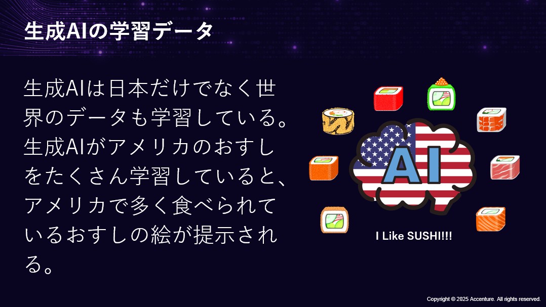 古谷は「おすしをかいて」というプロンプトに対し、日本人がイメージするにぎり寿司ではなくカルフォルニアロールの画像が生成された例を示し、「どうしてにぎりずしではなく巻きずしの画像になったのかな?」と問いかけました。