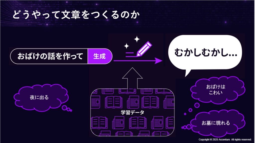 あまり事細かく説明すると難しくなってしまうので、イメージができるよう易しくを意識し、おばけの話の生成を例にしました。