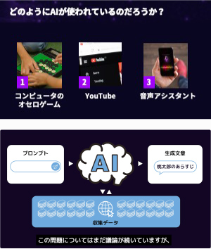 近年、ChatGPTをはじめとする生成AIツールが社会に急速に普及し、生成AIを活用する場面が増えてきました。このような状況の中で、小学生のうちから生成AIの特徴や仕組みを理解し、適切に活用する力を身につけることが重要になってきています。本授業では実際の生成AIの画面を見せながら、生成AIとはどのような仕組みで文章や画像を生成しているかを理解したり、生成AIを活用する事のメリット・デメリットを考えたりします。生成AIに対するリテラシー向上を目的としたプログラムです。