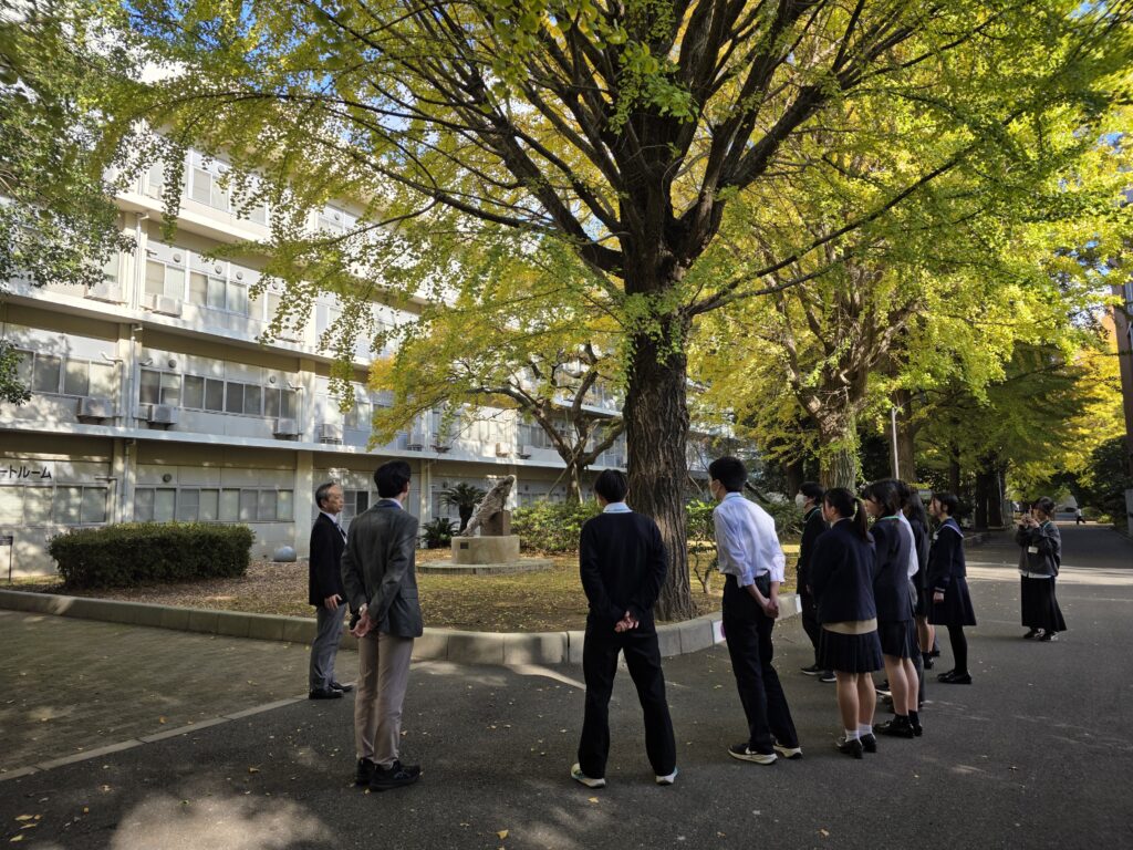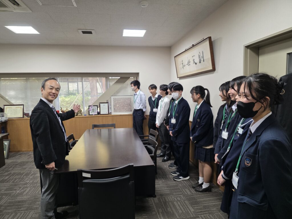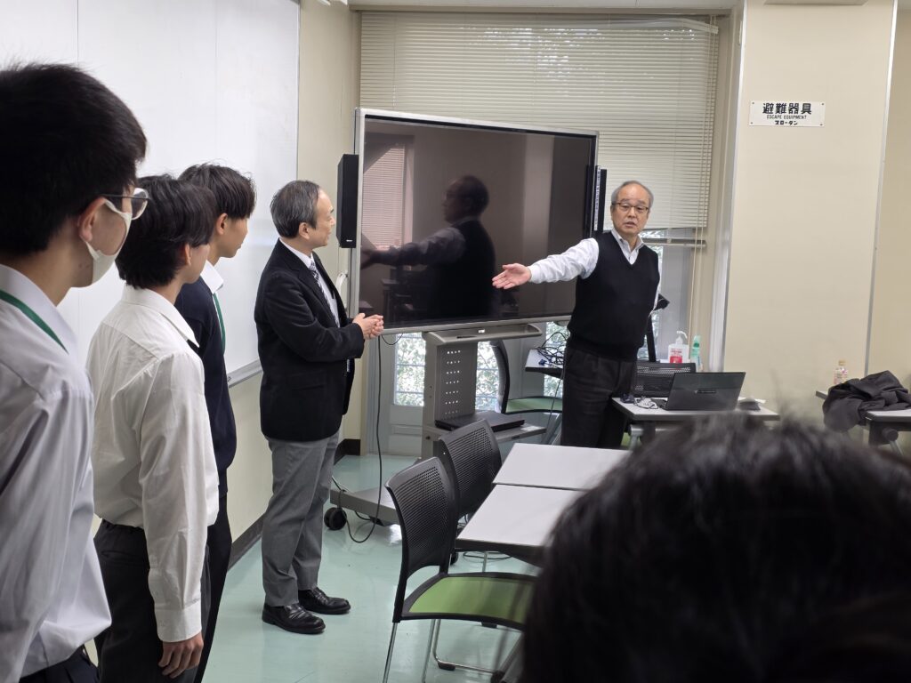 講義を実施されていた伊藤裕志特任教授は快く高校生を教室内に招き入れて下さり、「教職大学院の学生は現職の教員が多いので、大学教員が教えるというよりも、協議を通して互いに学び合う活動を大切にしています。」と説明してくださいました。