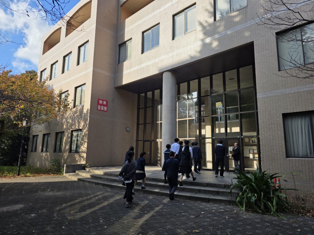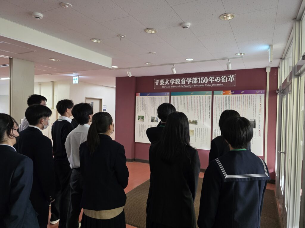 千葉大学の敷地は広く、教育学部では、各教科に関わる研究室や建物がある他、隣接して教育学部附属の小学校・中学校があることは珍しい特徴の一つであることが紹介されました。立地を活かして大学の授業(90分)の時間内に隣接の附属小中学校で授業実践をすることもあるなど、研究と共にある大学の学びについて教えていただきました。